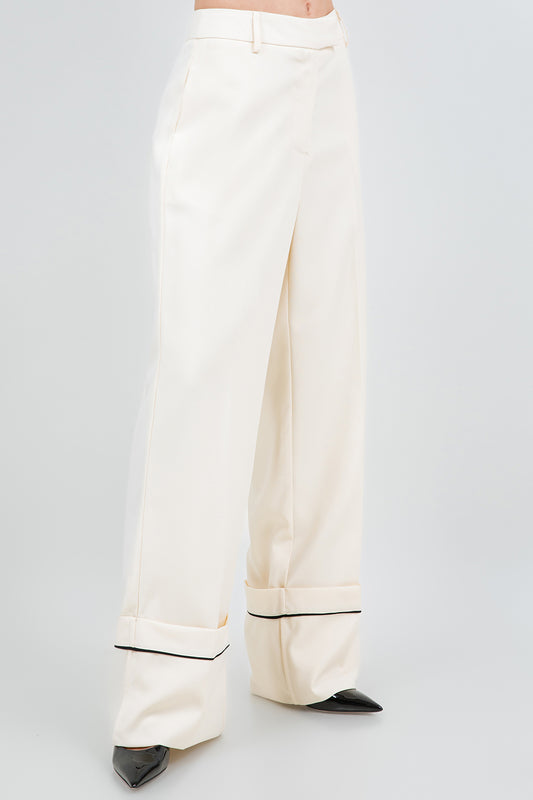 STRAIGHT LEG TROUSERS WITH PIPING CUFFED HEMS - EGGSHELL