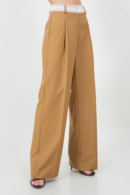 CONTRAST LACE WAISTBAND WOVEN TROUSERS - TAN/WHITE