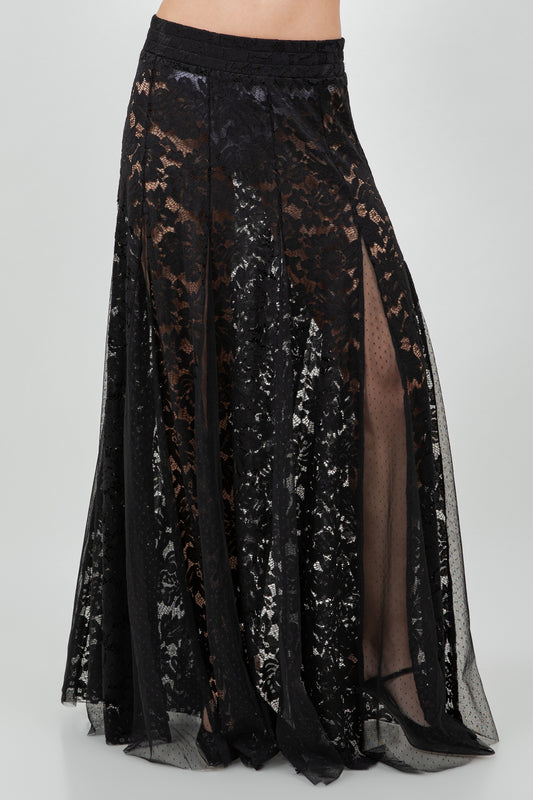 SHEER LACE MAXI SKIRT WITH ELASTIC WAISTBAND - BLACK