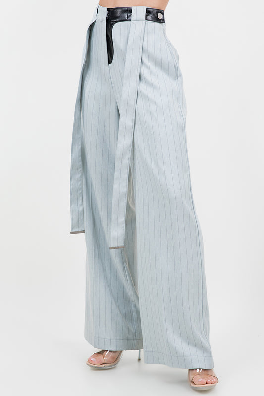 PINSTRIPE PU COMBO TROUSERS WITH STRAP DETAILS - LT BLUE/BLACK