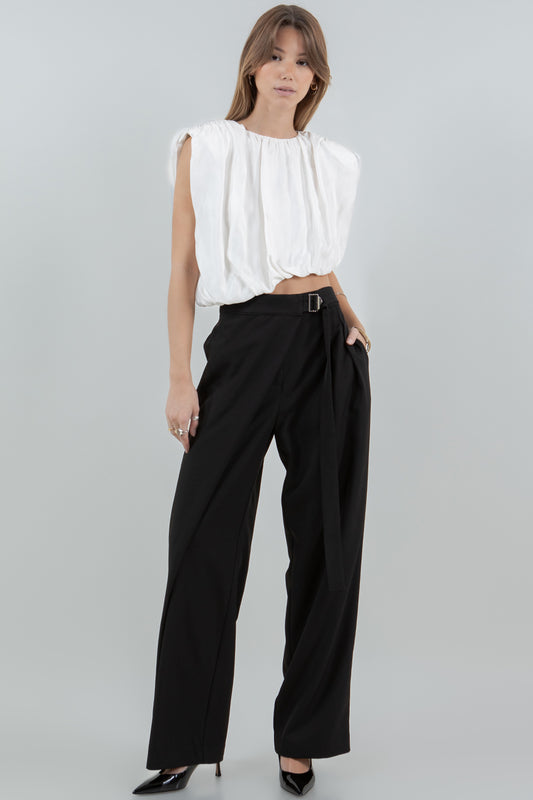 PLEATED WRAP OVER ADJUSTABLE BELT TROUSERS - BLACK
