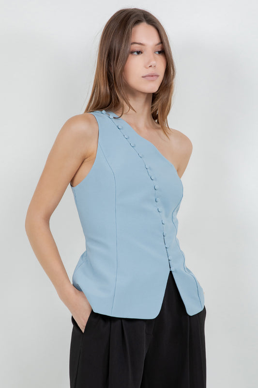 STRUCTURED WOVEN ASYMMETRICAL SLEEVELESS TOP WITH BUTTON ACCENT