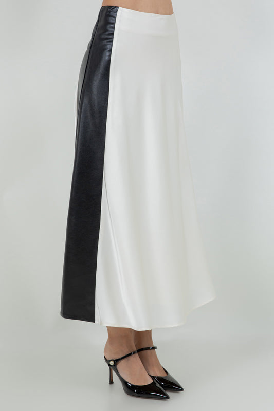 SATIN MIDI SKIRT WITH CONTRAST PU LEATHER PANELS