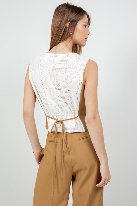 WOVEN VEST WITH CONTRAST CROCHET BACK - TAN/WHITE